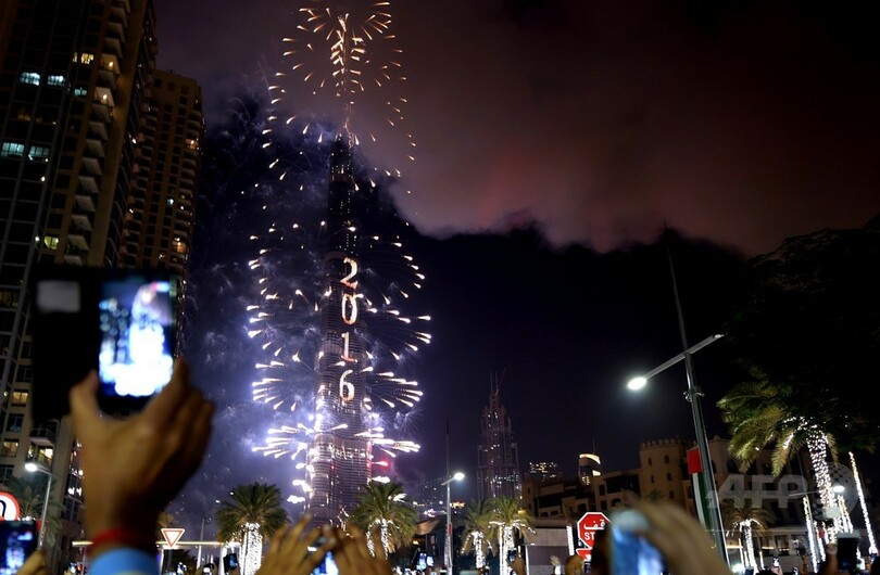 同市の花火大会は予定通り開催された。午前0時を回ると、高さ828メートルのブルジュ・ハリファを皮切りに各地で花火が上がり、数千人の見物客が歓声で迎えた。(c)AFP