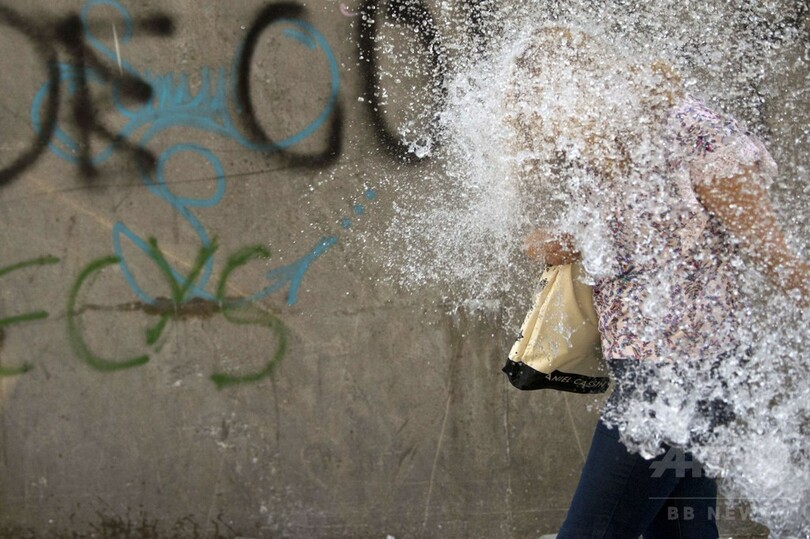 【1月1日 AFP】ウルグアイの首都モンテビデオ(Montevideo)の旧市街では12月31日、大みそか恒例の祝賀行事の「水かけ」が行われた。モンテビデオの金融街では毎年大みそかに、オフィスの窓から破ったカレンダーのページを投げ捨てたり、通行人に水をかけたりするならわしがある。(c)AFP