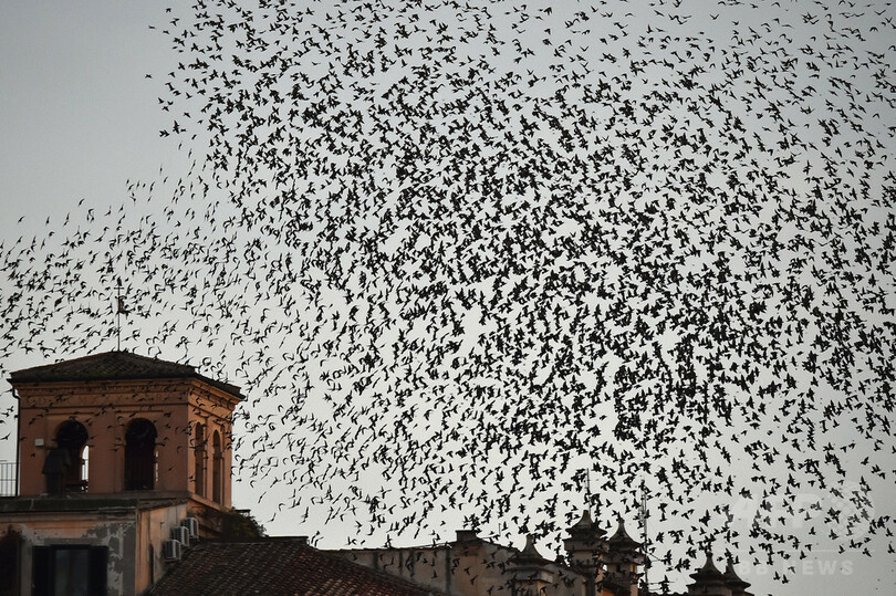 歴史あるローマの建築物の上空を舞うムクドリの大群は、同市の風物詩の1つだが、財政事情の厳しいローマ市にとっては「ふん害」が毎年の悩みの種となっている。特にこの冬は、テベレ川沿いのプラタナスの木立からムクドリを追い払う対策の開始時期が、経費削減のため例年より遅かった。(c)AFP