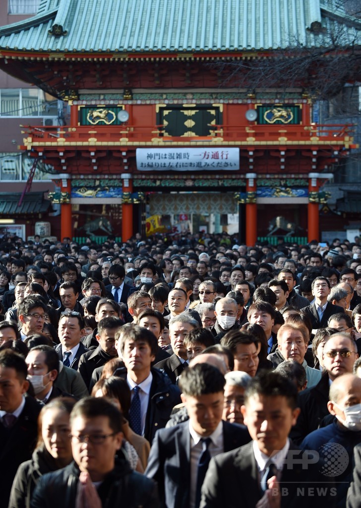 【1月4日 AFP】商売繁盛のご利益で知られる東京・千代田区の神田明神(Kanda shrine)に4日、大勢の会社員らが新年の仕事始めの参拝に訪れた。4日と5日の2日間で、4000社が祈祷を受けるという。(c)AFP