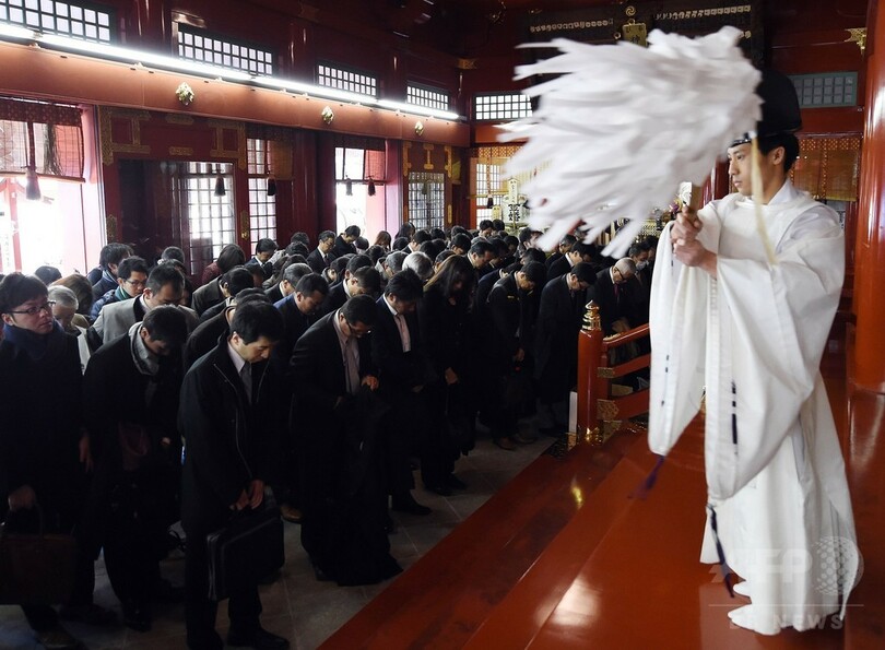 【1月4日 AFP】商売繁盛のご利益で知られる東京・千代田区の神田明神(Kanda shrine)に4日、大勢の会社員らが新年の仕事始めの参拝に訪れた。4日と5日の2日間で、4000社が祈祷を受けるという。(c)AFP