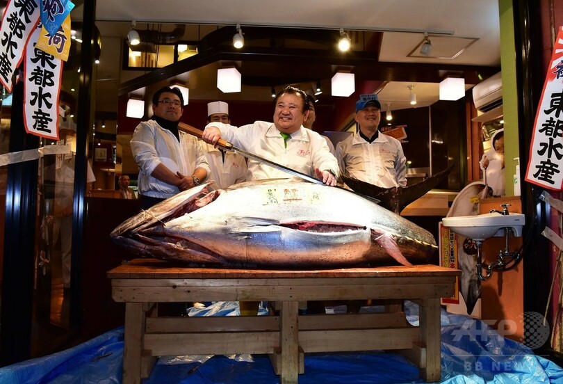 競り落としたのは、すしチェーン「すしざんまい(Sushi-Zanmai)」を展開する企業「喜代村(Kiyomura)」の木村清(Kiyoshi Kimura)社長。社長は後に、すしざんまい店舗でこのクロマグロの解体を披露した。築地市場は今秋、豊洲での新市場の開業に伴い、80年を超える歴史に幕を閉じる。(c)AFP