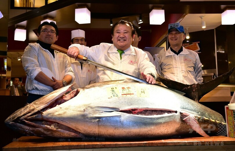 競り落としたのは、すしチェーン「すしざんまい(Sushi-Zanmai)」を展開する企業「喜代村(Kiyomura)」の木村清(Kiyoshi Kimura)社長。社長は後に、すしざんまい店舗でこのクロマグロの解体を披露した。築地市場は今秋、豊洲での新市場の開業に伴い、80年を超える歴史に幕を閉じる。(c)AFP