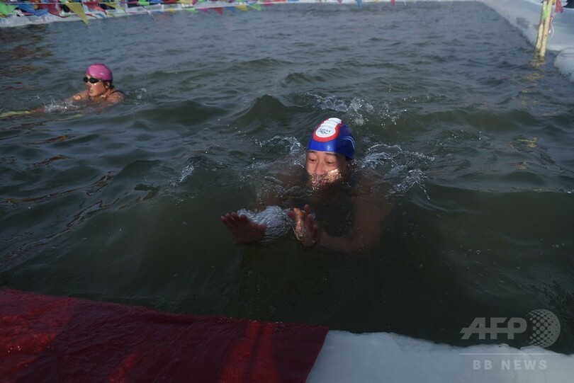 【1月6日 AFP】中国東北部・黒竜江(Heilongjiang)省ハルビン(Harbin)で5日、毎年恒例の「ハルビン国際氷雪祭(Harbin International Ice and Snow Sculpture Festival)」が開幕し、関連イベントとして寒中水泳大会が行われた。大会の参加者らは、厚い氷製のプールに張られた冷たい水の中を寒さをものともせず泳いでいた。