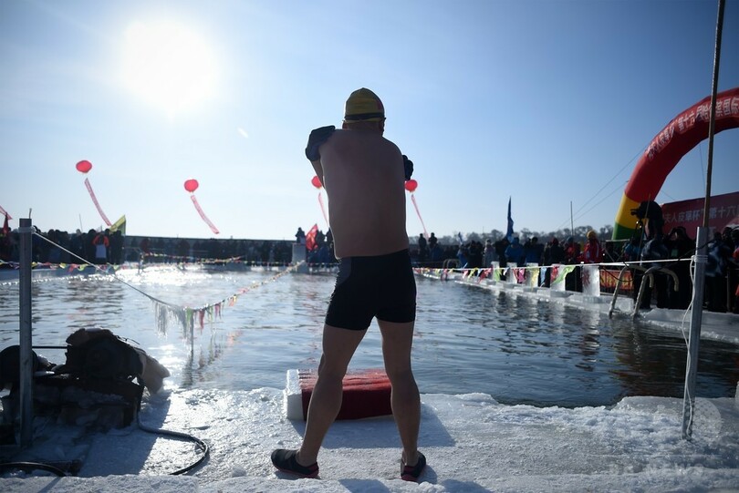 【1月6日 AFP】中国東北部・黒竜江(Heilongjiang)省ハルビン(Harbin)で5日、毎年恒例の「ハルビン国際氷雪祭(Harbin International Ice and Snow Sculpture Festival)」が開幕し、関連イベントとして寒中水泳大会が行われた。大会の参加者らは、厚い氷製のプールに張られた冷たい水の中を寒さをものともせず泳いでいた。