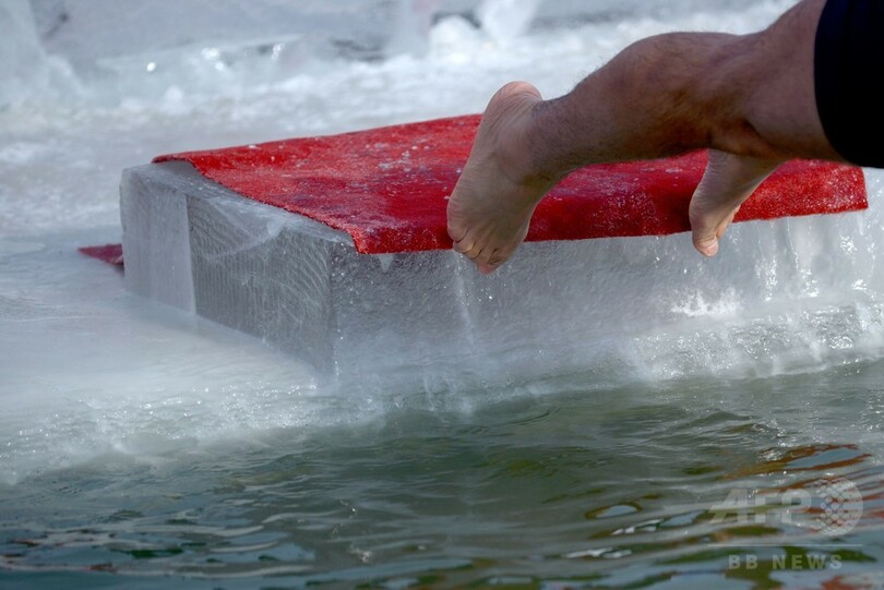 【1月6日 AFP】中国東北部・黒竜江(Heilongjiang)省ハルビン(Harbin)で5日、毎年恒例の「ハルビン国際氷雪祭(Harbin International Ice and Snow Sculpture Festival)」が開幕し、関連イベントとして寒中水泳大会が行われた。大会の参加者らは、厚い氷製のプールに張られた冷たい水の中を寒さをものともせず泳いでいた。