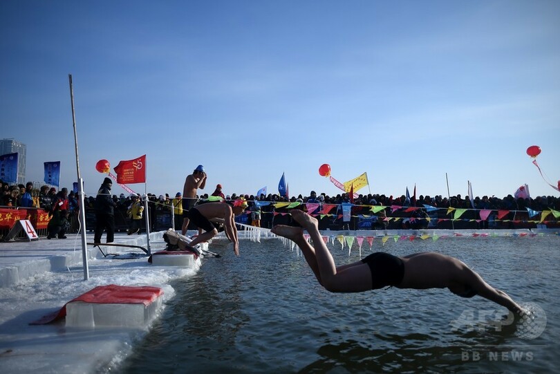 【1月6日 AFP】中国東北部・黒竜江(Heilongjiang)省ハルビン(Harbin)で5日、毎年恒例の「ハルビン国際氷雪祭(Harbin International Ice and Snow Sculpture Festival)」が開幕し、関連イベントとして寒中水泳大会が行われた。大会の参加者らは、厚い氷製のプールに張られた冷たい水の中を寒さをものともせず泳いでいた。