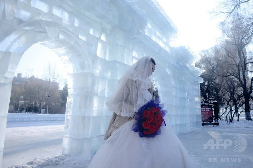 氷雪像に映える純白の花嫁、「ハルビン国際氷雪祭」で結婚式