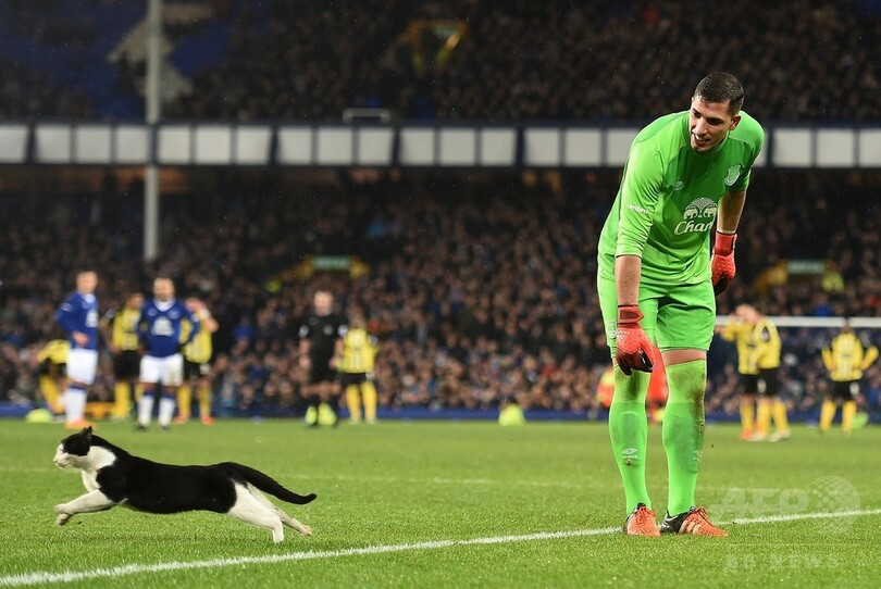 白黒のネコは、近寄ってきたエバートンGKのジョエル・ロブレス(Joel Robles)をかわしたものの、最後はエバートンの本拠地グディソン・パーク(Goodison Park)の警備員に取り押さえられて、試合は無事に再開された。