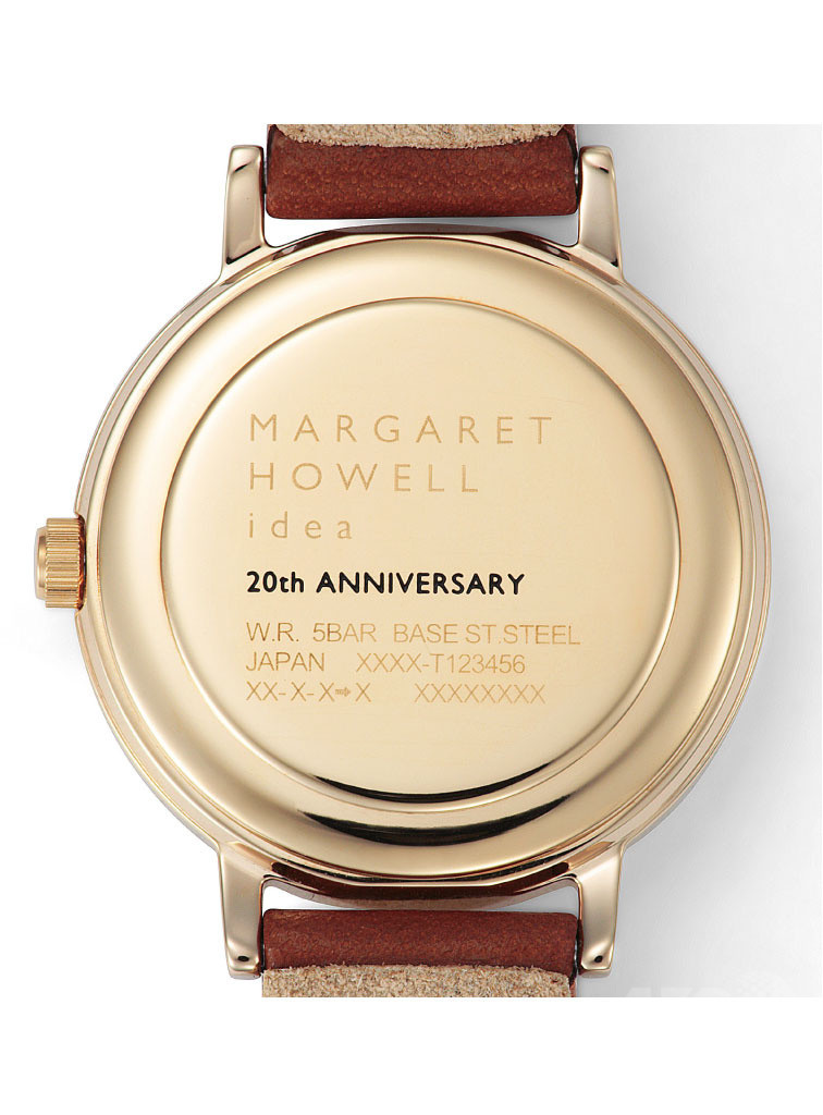 マーガレット・ハウエルらしいミニマルなデザインは、手元に上品さをプラス。ゴールドカラーケースに包まれたダイアルには、ダイヤモンドをワンポイント配置し、特別感のある仕上がりとなった。ブラウン、ダークブラウンのシックなレザーバンドで、どんなファッションにもコーディネートすることができる。ケースバックには20周年記念の刻印が施された。各カラー800本限定で、価格は税抜35,000円。