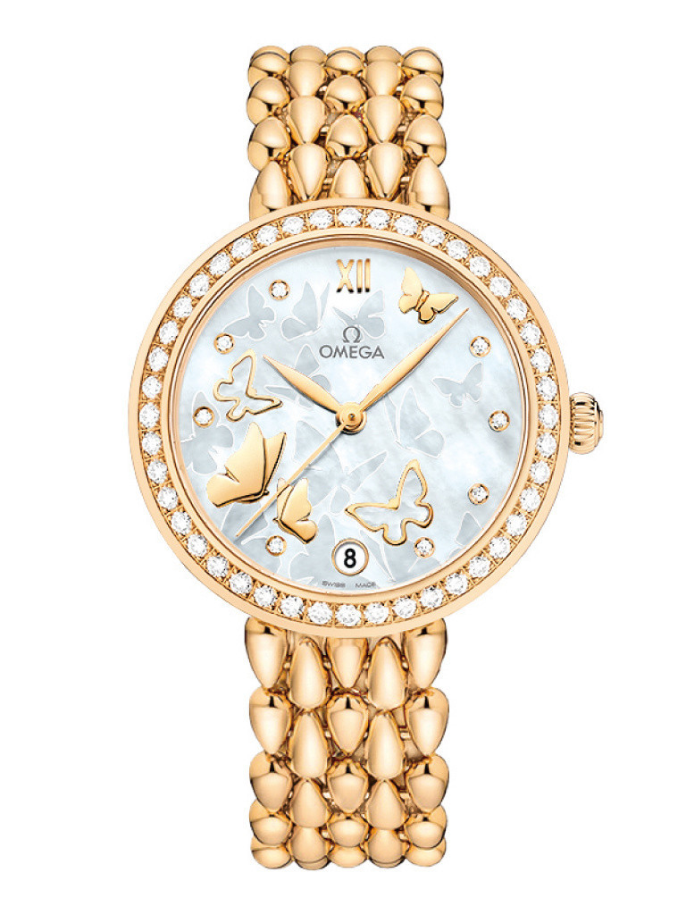ブレスレットモデルは、18Kレッドゴールドまたは18Kイエローゴールド製のデュードロップ[しずく]型ビーズが連なり、華やかで優雅な印象。ダイアルには金色の蝶がデザインされたものと、プレーンなマザーオブパールの2種を用意し、どちらもダイヤモンドを敷き詰めたベゼルが華を添えている。