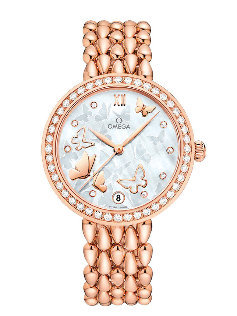 ブレスレットモデルは、18Kレッドゴールドまたは18Kイエローゴールド製のデュードロップ[しずく]型ビーズが連なり、華やかで優雅な印象。ダイアルには金色の蝶がデザインされたものと、プレーンなマザーオブパールの2種を用意し、どちらもダイヤモンドを敷き詰めたベゼルが華を添えている。
