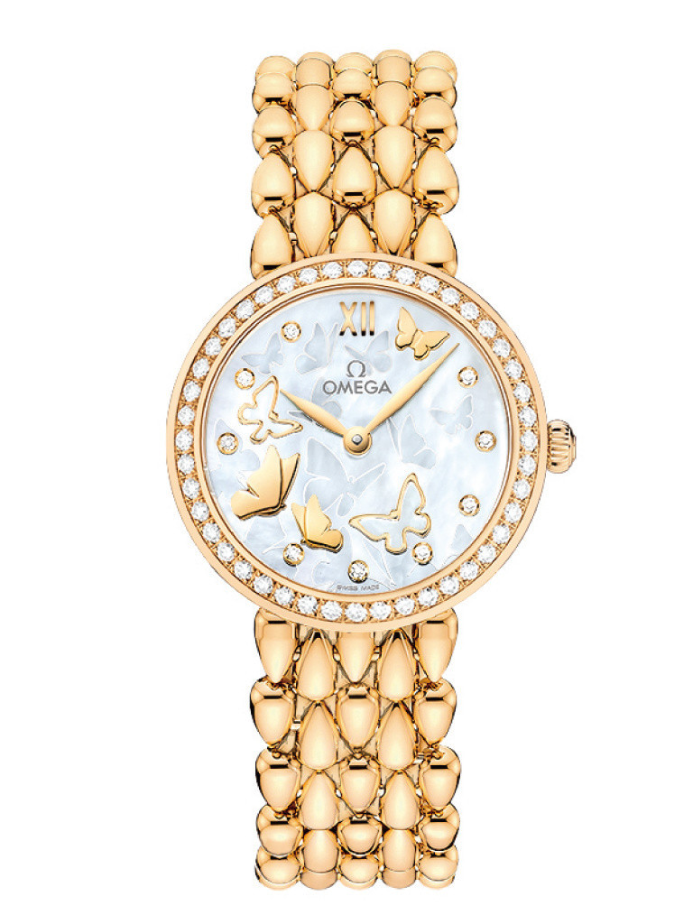 ブレスレットモデルは、18Kレッドゴールドまたは18Kイエローゴールド製のデュードロップ[しずく]型ビーズが連なり、華やかで優雅な印象。ダイアルには金色の蝶がデザインされたものと、プレーンなマザーオブパールの2種を用意し、どちらもダイヤモンドを敷き詰めたベゼルが華を添えている。
