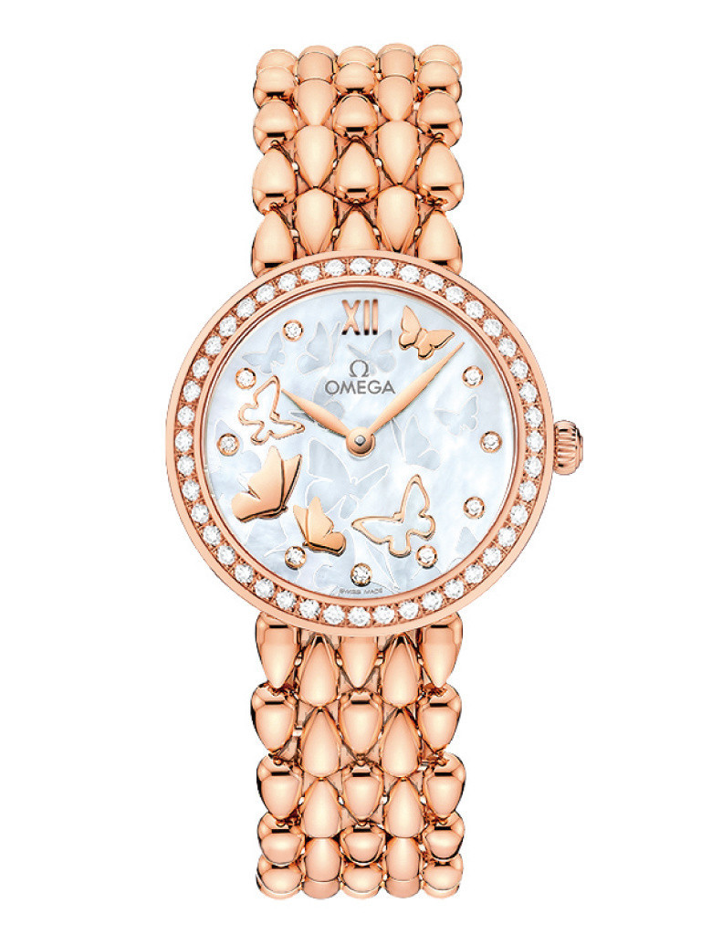 ブレスレットモデルは、18Kレッドゴールドまたは18Kイエローゴールド製のデュードロップ[しずく]型ビーズが連なり、華やかで優雅な印象。ダイアルには金色の蝶がデザインされたものと、プレーンなマザーオブパールの2種を用意し、どちらもダイヤモンドを敷き詰めたベゼルが華を添えている。