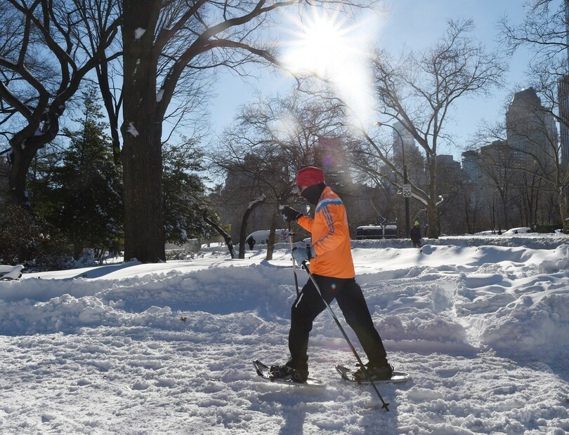 市中心部のセントラルパーク(Central Park)でも、そり遊びや雪合戦に興じる子どもたちや、生まれて初めての大雪を目にするよちよち歩きのわが子を連れた親たちら大勢の人でにぎわった。(c)AFP