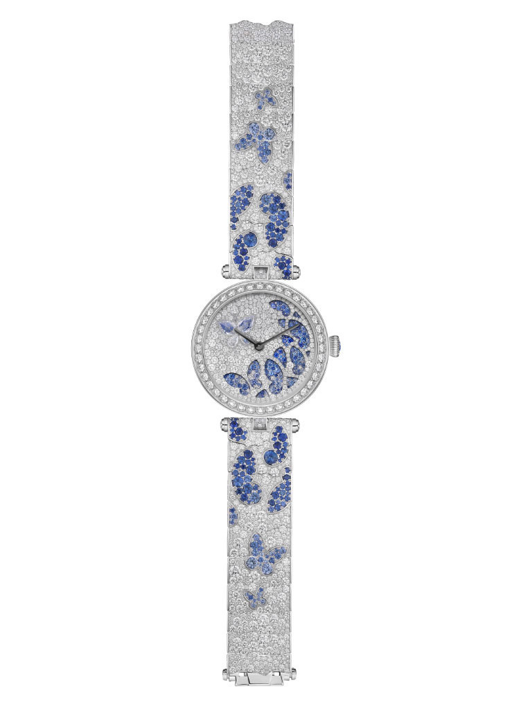 自然をモチーフに、変わりゆく植物の色で四季をあらわす「レディ ジュール デ フルール ウォッチ」やメゾンのアイコンである蝶が舞う「レディ ニュイ デ パピヨン ウォッチ」。ハイジュエリー コレクション「真夏の夜の夢」の妖精をあしらった「レディ アーペル ジュール ニュイ フェ オンディーヌ ウォッチ」は、時間と共に移り変わる風景を堪能できる。「レディ アーペル ロンド デ パピヨン」は、異なる色の3匹の蝶が雲の合間を舞いながら分を刻み、つばめが時を表示。天上の星々にオマージュを捧げるポエティック アストロノミーには、発電するムーブメントが光を文字盤に宿す「ミッドナイト ニュイ リュミヌーズ ウォッチ」が新たに加わった。