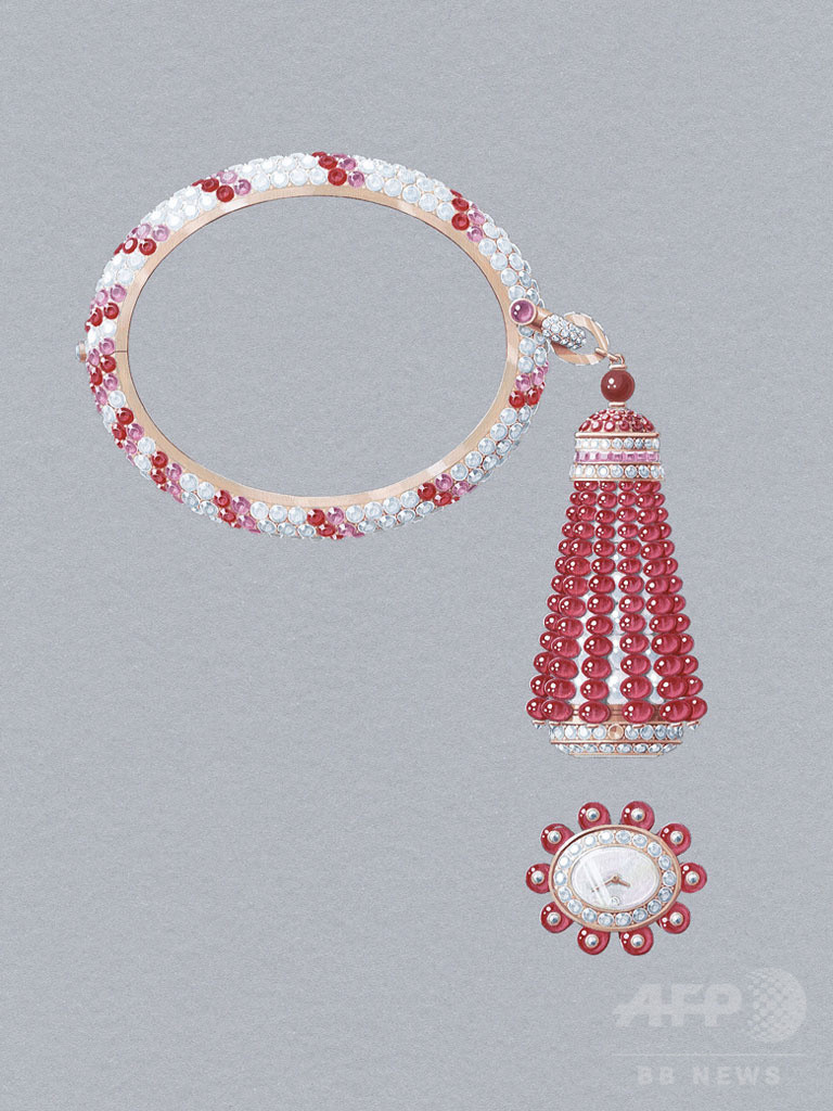 中でも注目は115石のルビーが連なる贅沢な「ルビー シークレット ブレスレットウォッチ」。ブレスレットに隠された文字盤は、ルビーを押して引き出しが開いたときのみ見ることができる。また、ロングネックレスに時計が潜むタッセルをアタッチできる「形を変える ポンポン ネックレス」も登場。メゾンが得意とする形を変えるジュエリーの伝統と、パールを用いた女性らしい美しさを追求したこのセットは、ロングネックレス、取り外し可能なタッセルに取り付けられたウォッチ、そしてブレスレットで構成され、多彩な組み合わせで装いを楽しめる。
