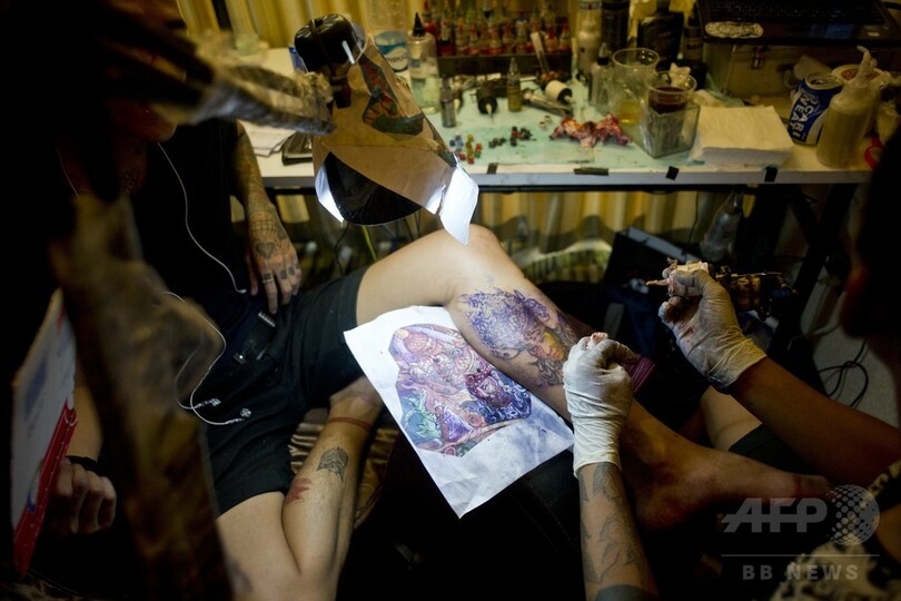しかし最近は、タトゥー・アーティストたちが、伝統的な道具よりも安全性が高いとされる現代のタトゥー用の機器を使って古典的な図柄と模様を復活させつつある。(c)AFP