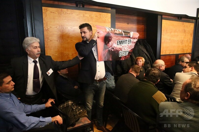 無罪判決は、傍聴席を埋め尽くした事故の被害者や犠牲者遺族らの間に強い怒りを巻き起こした。破壊された家々の写真を掲げた男性が「とんでもない判決だ!断固、抗議する!」と叫び、警備員に法廷の外へ連れ出される一幕もあった。(c)AFP/Peter MURPHY、Geza MOLNAR