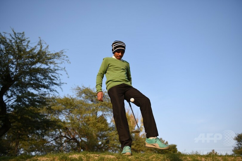 ジャグラン君は、両親と暮らすニューデリー(New Delhi)の自宅からゴルフ場に通い、キャディーを務める父親やコーチの見守る中、日々、ショットの練習に励んでいる。(c)AFP