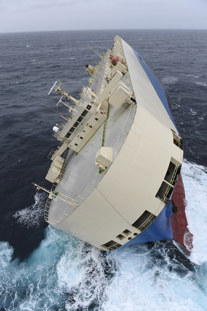 全長164メートル、パナマ船籍の同船は、3600トンの木材と建設機械を運んでいた。船が傾いたため、船員はヘリコプターで救助された。(c)AFP