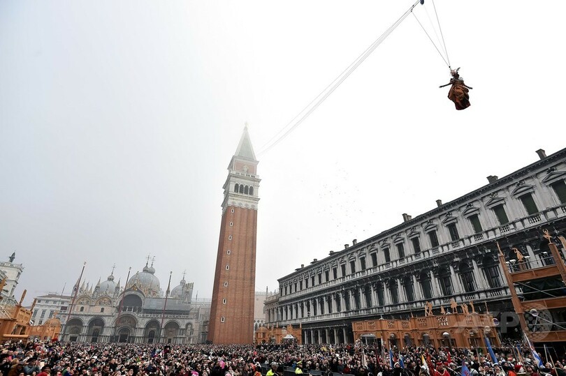 中世の衣装や仮面を身に着けた大勢の人々が押し寄せたサンマルコ広場(Piazza San Marco)では、メーンイベントの一つ「天使の飛行(Angel flight)」が行われ、イレーネ・リッツィ(Irene Rizzi)さんが鐘楼からロープを伝って滑空を披露した。
