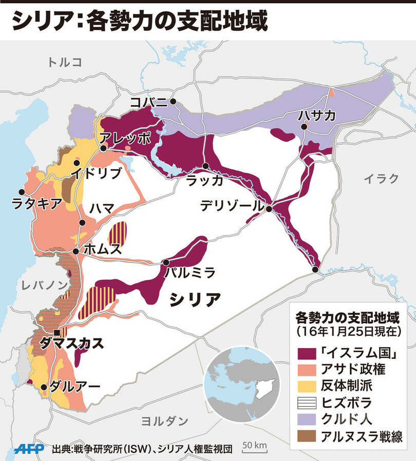 ニュース 戦争・紛争 図解 【図解】シリア:各勢力の支配地域 2016年2月3日 15:39 発信地:シリア [ 中東・北アフリカ シリア ] このニュースをシェア シリア国内での各勢力の支配地域を示した図。(c)AFP 【2月3日 AFP】シリアでの各勢力の支配地域を示した図。(c)AFP 戦争・紛争 一覧へ> メディア・報道関係・法人の方向け 写真・動画 購入のお問合せ>