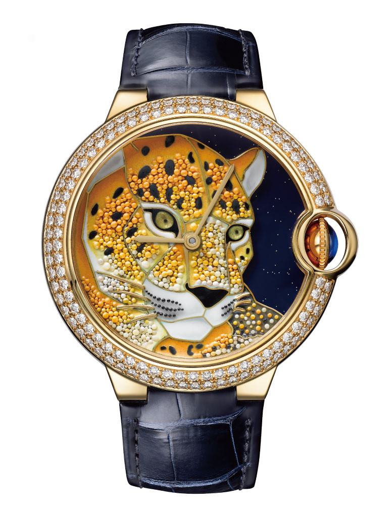 他にも注目したいのは、職人技を極めたメティエダールコレクションに新たに加わる「バロン ブルー ドゥ カルティエ エナメル グラニュレーション パンテール モチーフ」。小さな金の粒を組み合わせて表現するグラニュレーション(粒金)手法をインスピレーションに、エナメルを使った立体的で色彩豊かなパンテール(豹)が誕生した。