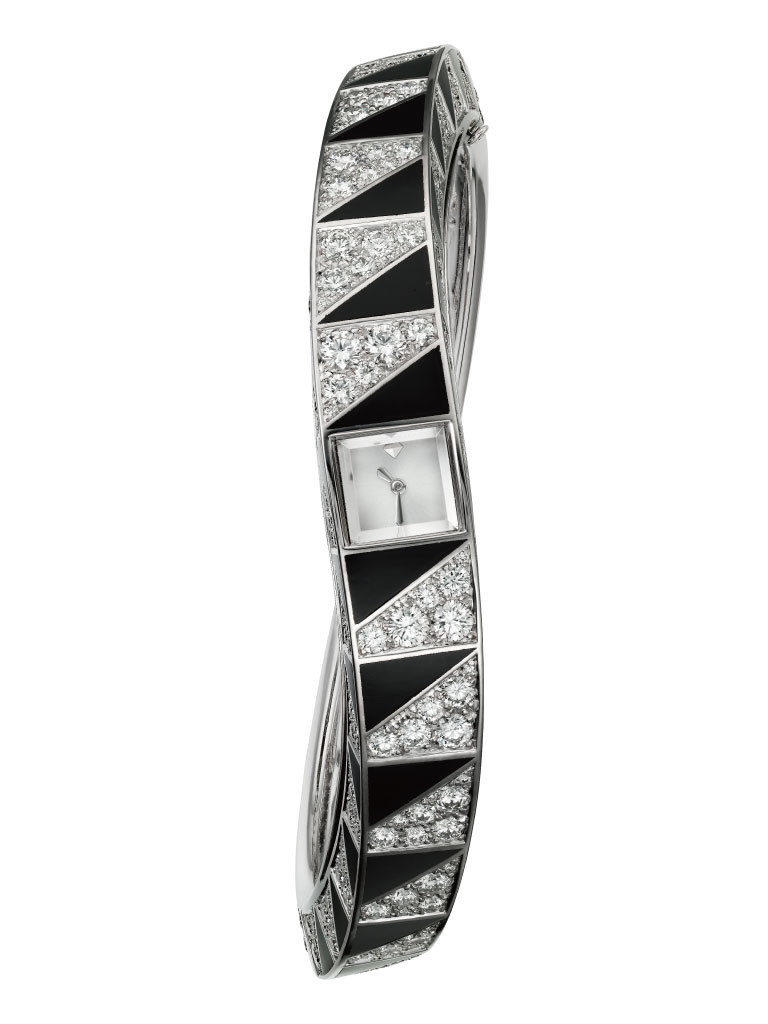 ミステリアス機構は、ダブルトゥールビヨンがぽっかりと浮かび上がる「ミステリアス トゥールビヨン アズール ペンダント ウォッチ」とダイヤモンドの鱗をもつドラゴンの「ドラゴン ミステリアス ウォッチ」が幻想的な手もとを演出。世界最小の手巻きメカニカルムーブメントを搭載したモデルには、ブラックの翡翠とホワイトのダイヤモンドがコントラストを描く「リングス オブ サターン モチーフ ウォッチ」と、無限をイメージする曲線美が際立った「カルティエ ア ランフィニ ウォッチ」がお目見えした。