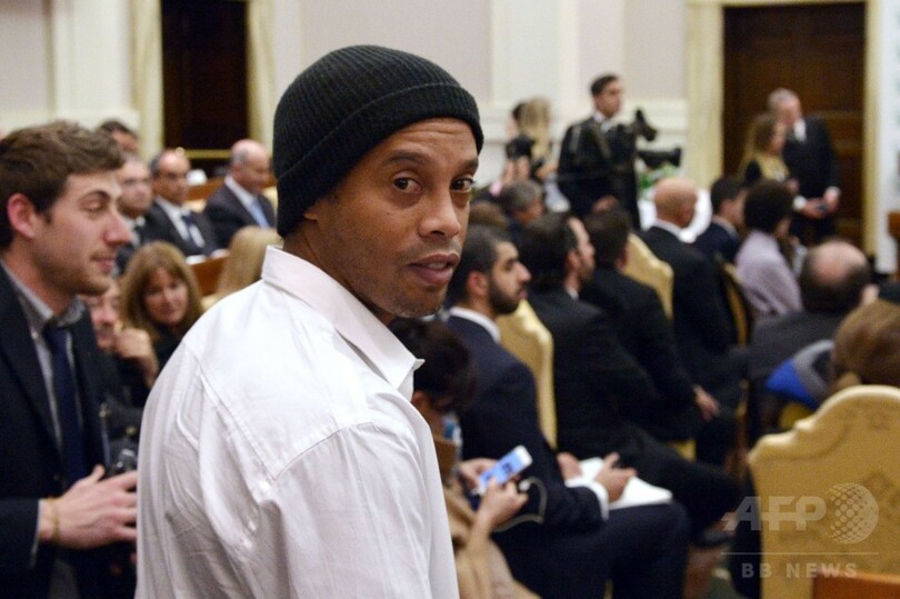 この日はロナウジーニョのほか、サッカー界のスター選手たちが法王を表敬訪問。2015年には、マラドーナ氏も法王の下を訪れていた。(c)AFP