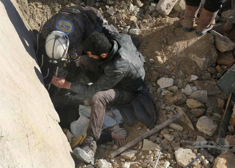 シリア北部アレッポの反体制派支配地区で、空爆により破壊されたとされる建物のがれきから犠牲者を収容する救助隊員(2016年2月4日撮影)。(c)AFP/THAER MOHAMMED