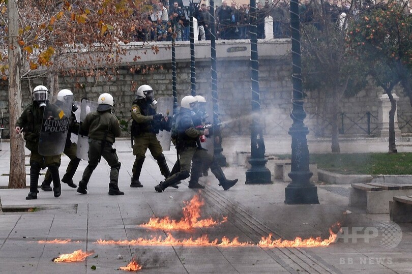 警察発表によると、デモにはアテネ(Athens)で4万人、同国第2の都市テッサロニキ(Thessaloniki)で1万4000人が参加。アテネでは暴徒化した若者らが機動隊に向かって火炎瓶を投げ付け、機動隊側が催涙ガスで制圧に当たる騒ぎとなった。