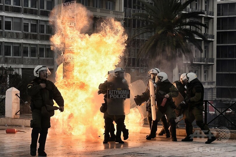 警察発表によると、デモにはアテネ(Athens)で4万人、同国第2の都市テッサロニキ(Thessaloniki)で1万4000人が参加。アテネでは暴徒化した若者らが機動隊に向かって火炎瓶を投げ付け、機動隊側が催涙ガスで制圧に当たる騒ぎとなった。
