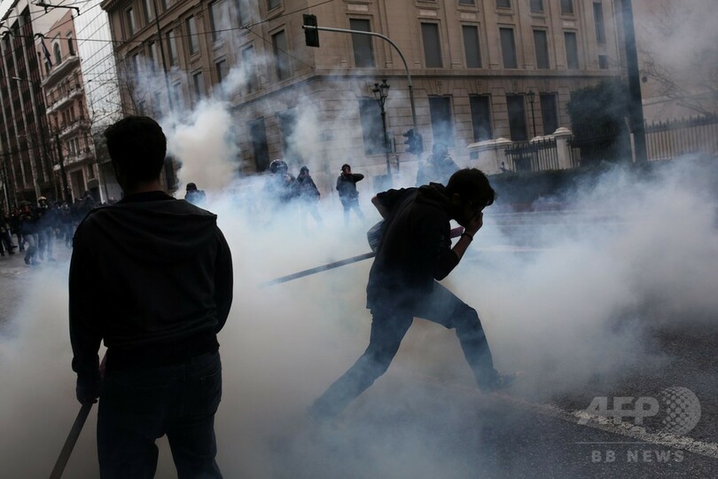 警察発表によると、デモにはアテネ(Athens)で4万人、同国第2の都市テッサロニキ(Thessaloniki)で1万4000人が参加。アテネでは暴徒化した若者らが機動隊に向かって火炎瓶を投げ付け、機動隊側が催涙ガスで制圧に当たる騒ぎとなった。