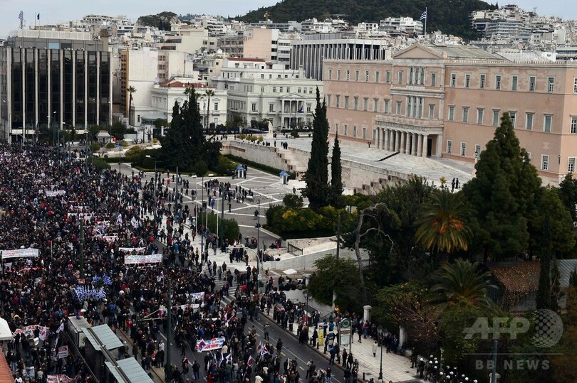 警察発表によると、デモにはアテネ(Athens)で4万人、同国第2の都市テッサロニキ(Thessaloniki)で1万4000人が参加。アテネでは暴徒化した若者らが機動隊に向かって火炎瓶を投げ付け、機動隊側が催涙ガスで制圧に当たる騒ぎとなった。
