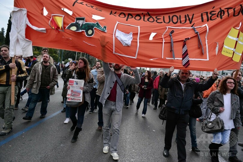 警察発表によると、デモにはアテネ(Athens)で4万人、同国第2の都市テッサロニキ(Thessaloniki)で1万4000人が参加。アテネでは暴徒化した若者らが機動隊に向かって火炎瓶を投げ付け、機動隊側が催涙ガスで制圧に当たる騒ぎとなった。