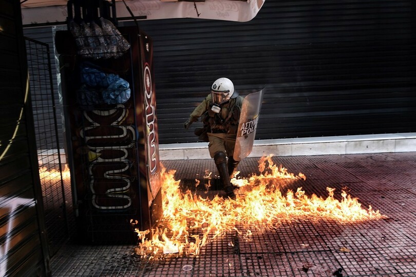 警察発表によると、デモにはアテネ(Athens)で4万人、同国第2の都市テッサロニキ(Thessaloniki)で1万4000人が参加。アテネでは暴徒化した若者らが機動隊に向かって火炎瓶を投げ付け、機動隊側が催涙ガスで制圧に当たる騒ぎとなった。