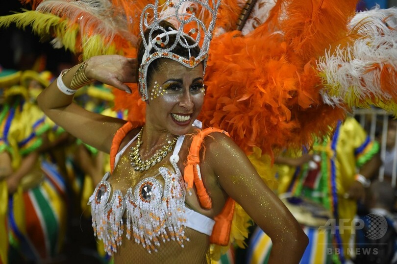 この催しでは、ダンサーとドラマーらが「コンパルサ」と呼ばれるグループを作り、伝統音楽「カンドンベ」のリズムに合わせた踊りや演奏で競い合う。(c)AFP