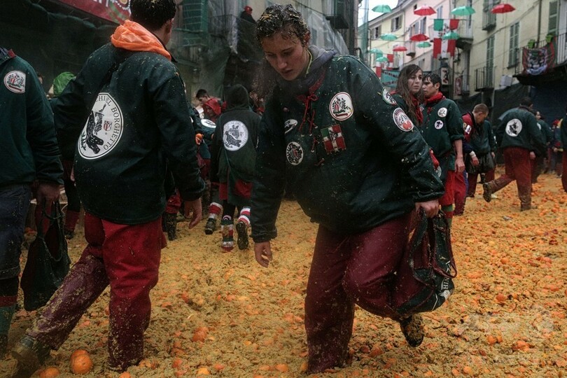 【2月8日 AFP】イタリア北部トリノ(Turin)近郊のイブレア(Ivrea)で7日、カーニバルシーズンの恒例イベント「オレンジ合戦」が開催された。