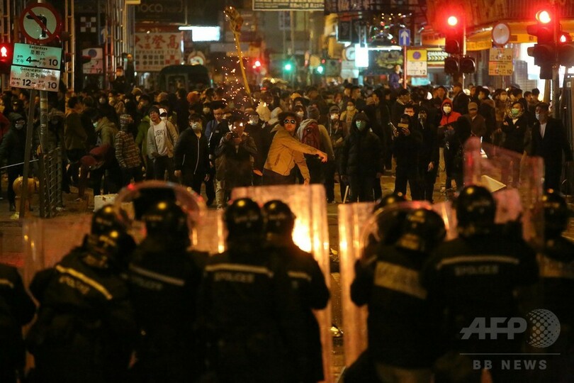 【2月9日 AFP】(写真追加)香港(Hong Kong)の繁華街、旺角(モンコック、Mongkok)地区で9日、当局による違法屋台の取り締まりをきっかけに発生した暴動に対し、警棒を持った警官隊が威嚇発砲を行い、催涙スプレーを使用した。地元ラジオ局RTHKが伝えた。
