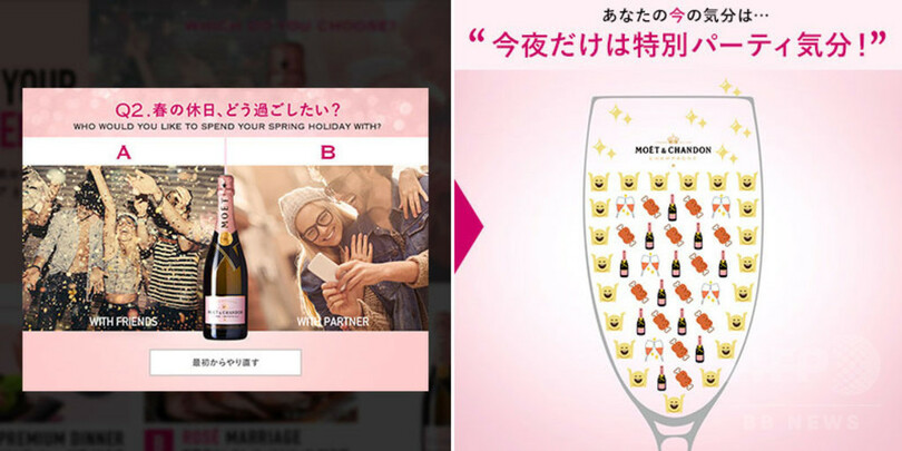 参加方法は、まず公式キャンペーンサイトにアクセス。この春出かけたい場所や楽しみたい相手など3つの質問に直感で回答するだけで、乾杯したい相手と今の気分が診断される。診断結果は「モエ・エ・シャンドン」のシャンパングラスにユニークな絵文字で表示され、SNSでシェアできる仕組みだ。診断にはあなたにぴったりのオススメ情報もついてくる