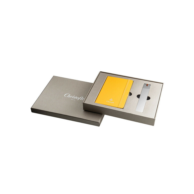 自分用やギフトアイテムとしても人気の高い「クリストフル」のブックマーカーに、ゴッホやピカソ、へミングウェイなど名だたる芸術家に愛されてきた「モレスキン」のハードカバータイプ ノートブックをセットした。ブックマーカーに刻まれたメゾンを象徴するヘキサゴン(蜂の巣をモチーフにした六角形)や、ノートブックの鮮やかなイエローがギフトに華を添えている。