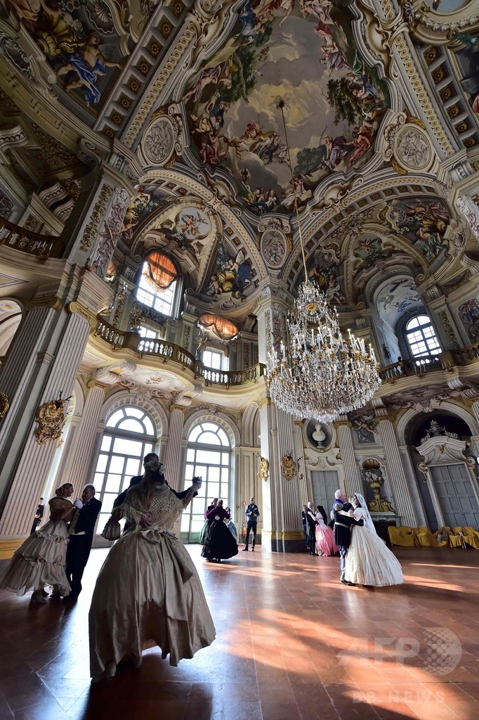 【2月15日 AFP】イタリア北部トリノ(Turin)近郊ストゥピニージ(Stupnigi)にあるサヴォイア(Savoia)王家の狩猟用の館「ストゥピニージ宮殿(Palazzina di caccia)」で14日、バレンタインデー(Valentine's Day)を祝う舞踏会が開催された。18世紀の衣装に身を包んだ人々が参加し、踊りを楽しむ人々や、キスするカップルなどの姿が見られた。(c)AFP