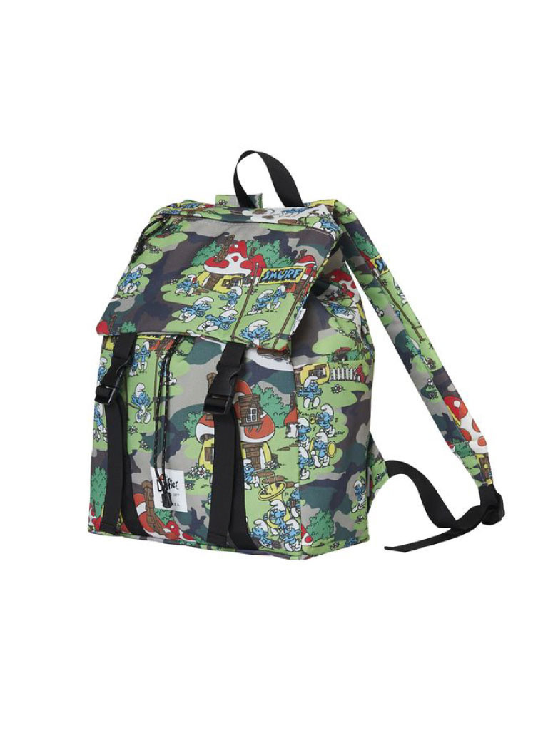 プリントは、ベルギー生まれの世界的キャラクター「スマーフ」を使ったオリジナルの迷彩柄。「スマーフ」はヨーロッパの森の中に住む架空の生物で、スマーフ村で繰り広げられる不思議な世界はどことなく1960年代後半から70年代前半のヒッピーカルチャーにシンクロしている部分もあり、「ヒステリックグラマー」と相性の良い世界観であったことから、今回のコラボレーションが実現した。