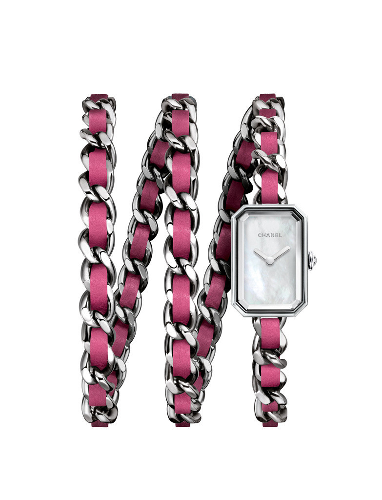 「プルミエール」は、パリのヴァンドーム広場と香水「シャネル N°5」のボトルストッパーから着想を得た八角形のケースが特徴のレディースウォッチ。これに3連チェーンブレスレットをセットした「プルミエール ロック」から、昨年発売したパステルカラーのモデルに続いて今年はポップカラーの新作がお目見えした。
