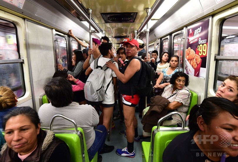 【2月22日 AFP】メキシコの首都メキシコ市(Mexico City)で21日、上半身や足元は普段通りでも、下半身はズボンやスカートをはかずに下着一枚で地下鉄などに乗車するイベント「No Pants Subway Ride(パンツなしで地下鉄に乗ろう)」が開催された。