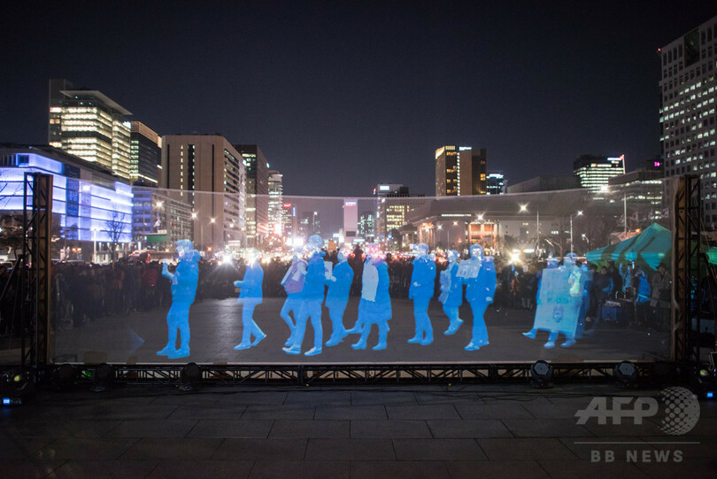 ソウル中心部の各所に設置された透明のスクリーンには、横断幕を手に「デモはわれわれの権利だ」「市民の声を押さえ付けるな」などのスローガンを叫ぶ青白いホログラムの人々が映し出された。(c)AFP