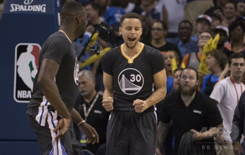 続くサンダーの攻撃でウエストブルックがジャンプシュートを外すと、この瞬間のために舞台が整えられていたかのように、カリーがまたしても劇的な3ポイントシュートを決め、試合に決着をつけた。(c)AFP