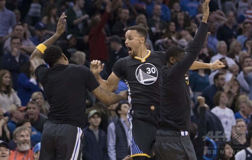 【2月28日 AFP】15-16NBAは27日、各地で試合が行われ、ゴールデンステイト・ウォリアーズ(Golden State Warriors)は試合終了直前にステフェン・カリー(Stephen Curry)の3ポイントシュートが決まり、オクラホマシティ・サンダー(Oklahoma City Thunder)とのオーバータイムを121-118で制した。