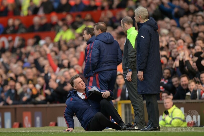 この日、アーセナル(Arsenal)と対戦したユナイテッドだが、試合の中で、アーセナルの選手がダイブ(シミュレーション)したのではないかと考えたファン・ハール監督は、タッチライン際で第4審判のマイク・ディーン(Mike Dean)氏のもとに詰め寄り、背中から地面に倒れて自身の主張を説明した。